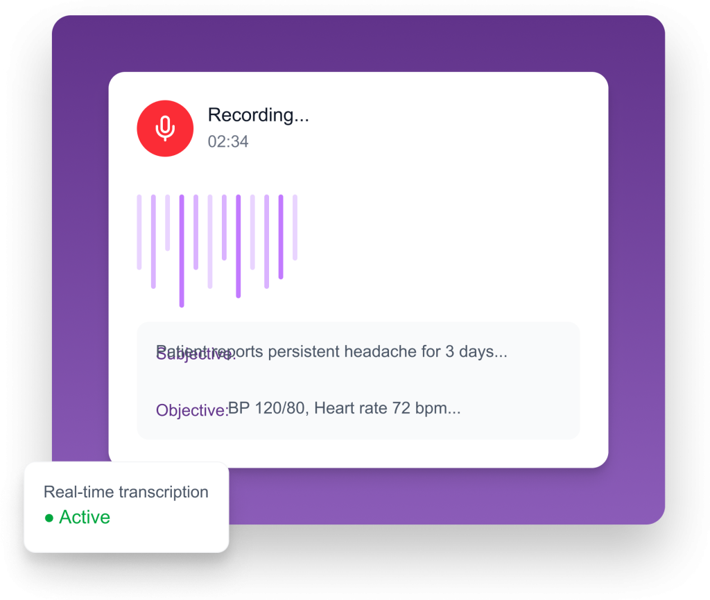 Automatically formats into SOAP notes (Subjective, Objective, Assessment, Plan) or your preferred structure. Smart paragraphing and section detection make notes readable and professional.